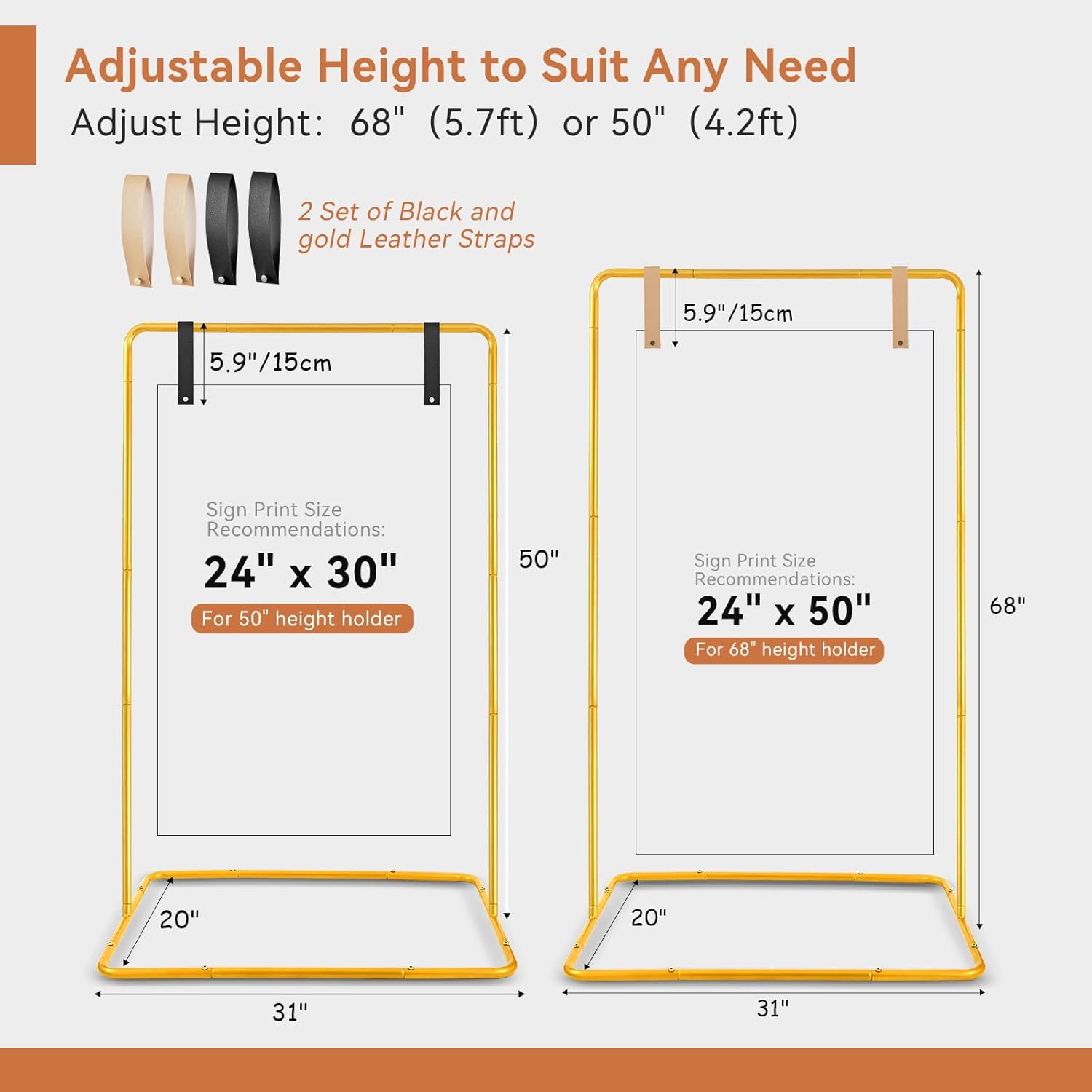 Wedding Welcome Sign Stand, 68”x31”x 20” Heavy Duty Easel Stand for Sign with 4 Leather Strap, Welcome to Our Wedding Sign Holder, Metal Floor Standing Easels for Signs, Poster, Gold